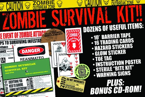 Protect your community from the undead with this Zombie Outbreak Survival Kit filled with dozens of useful items Included in this kit are 10 of yellow Caution Zombie Outbreak Zone barrier tape 16 trading cards 4 warning signs 8 hazard stickers 2 toe tags an instructional poster a bite Read More..