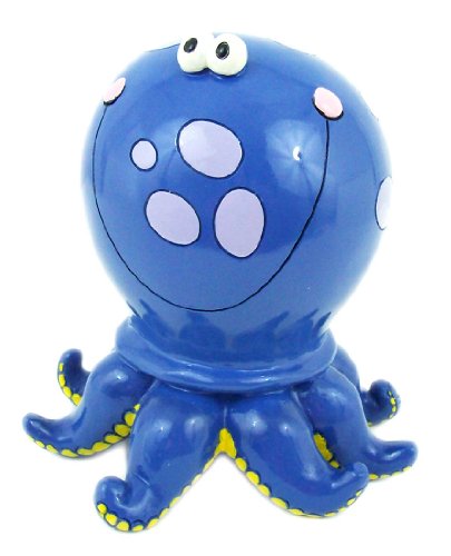BRThis adorable cold cast resin blue polka dot octopus figurine doubles as a piggy bank and really brightens up a room The bank measures 6 inches tall 6 inches wide and 5 inches deep It empties via a twist off plastic piece on the bottom He is hand-painted and makes a great gift for octopus l Read More..